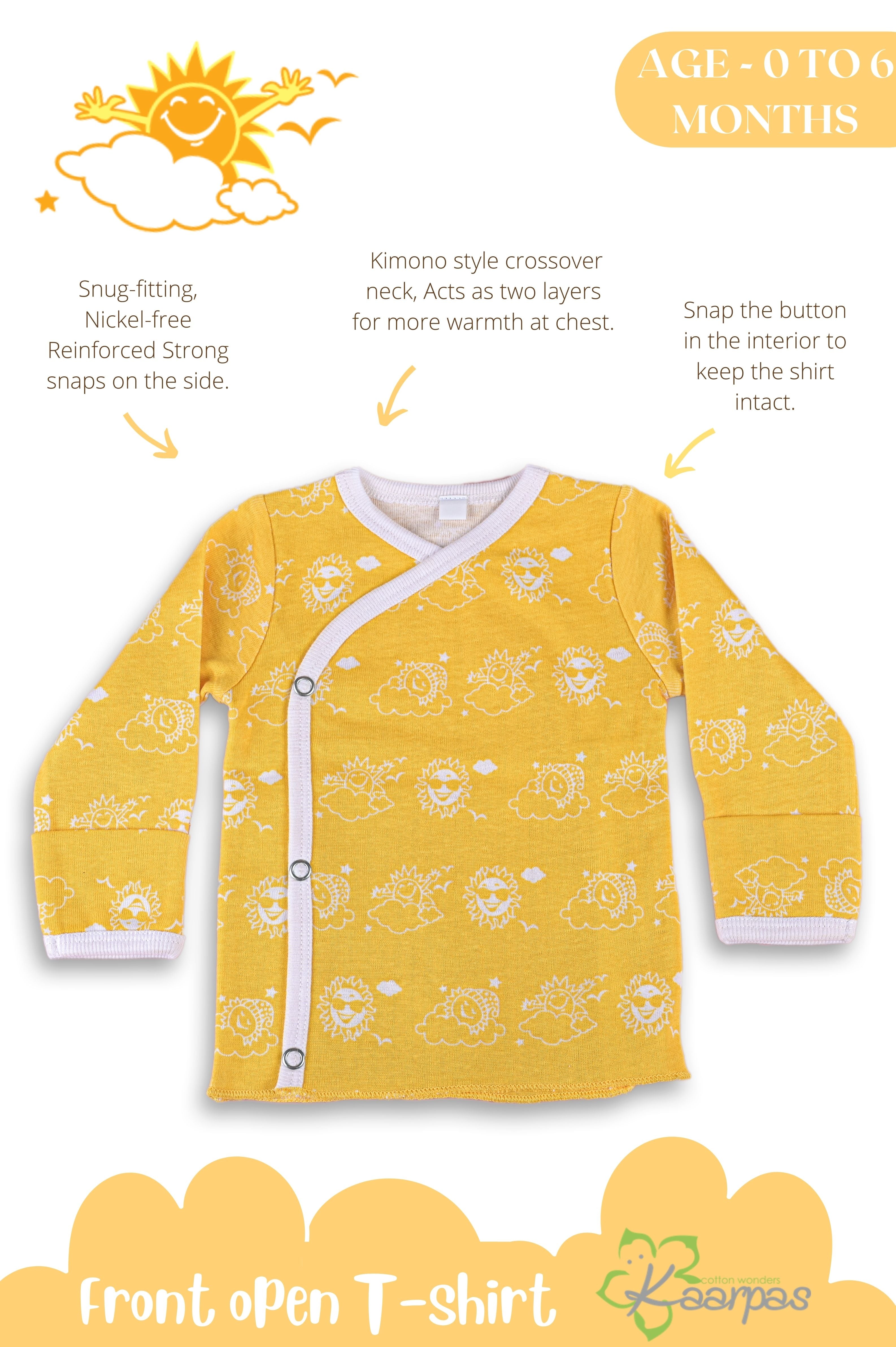 ✔ACTIVE WEAR: Breathable, Stretchable and Active fabric for rapid activities of your baby providing maximum comfort. Full-sleeved Front Open Tee Shirt with Kimono style crossover neck, Acts as two layers for more warmth at the chest. Snug fitting, Nickel-free Reinforced Strong snaps on the side. Snap a button in the interior to keep the T-shirt intact on the baby. Irritation-free completely removable labels.