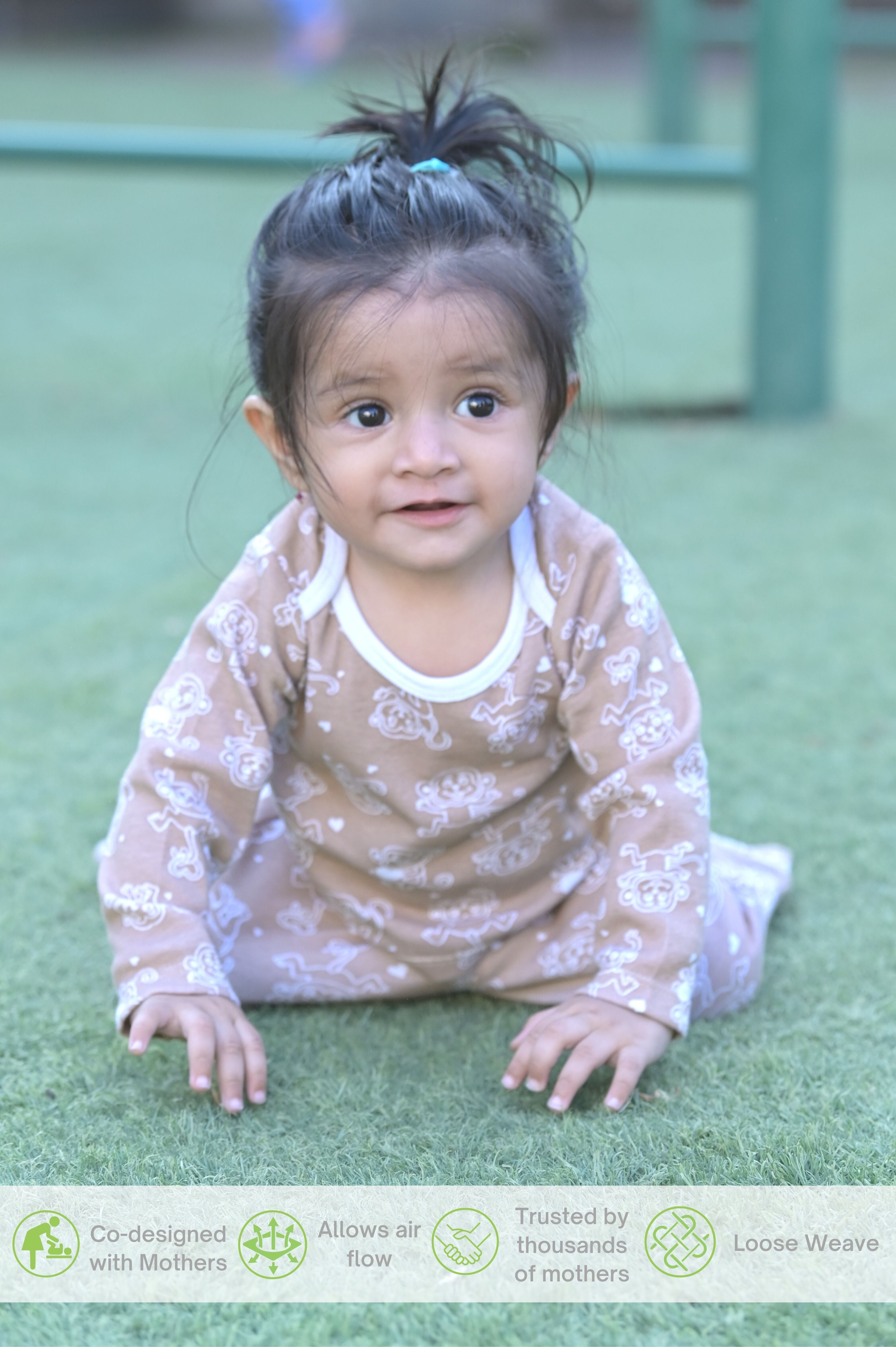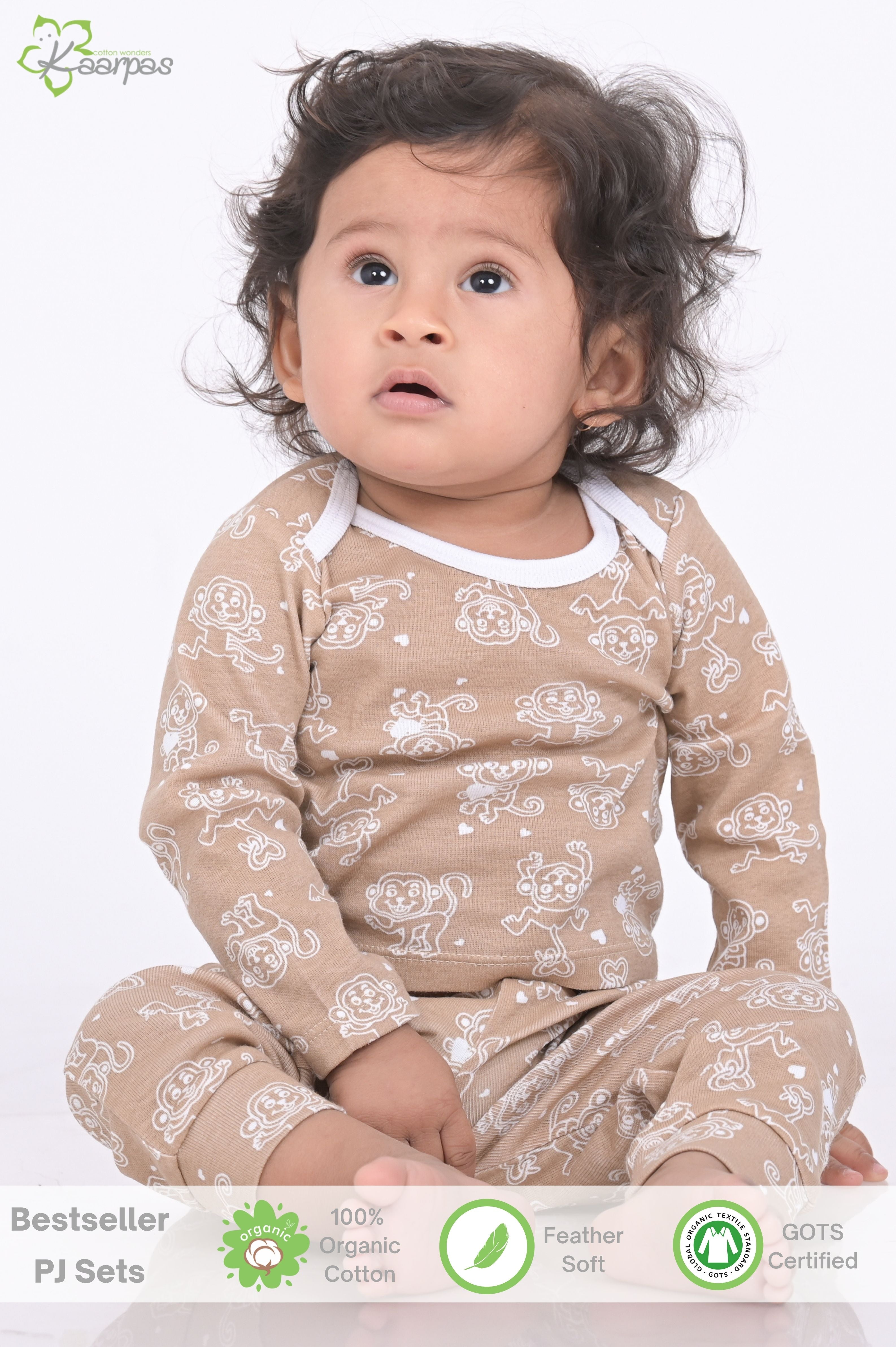 ✔PYJAMA PANT SET PACK 1: jumping monkey- Brown Snug fitting yet stretchable PJ set are Feather soft, breathable, lightweight & GOTS Certified. Made of 100% Organic Cotton Fabric Making It Soft & Gentle for your Baby’s Skin. Designed with Removable Labels which you can easily pull off so it doesn’t irritate your Baby's Skin. Our Quality Stitching Make It Durable and Long Lasting. The actual product may differ slightly in colour from the one illustrated in the images due to lights and photography